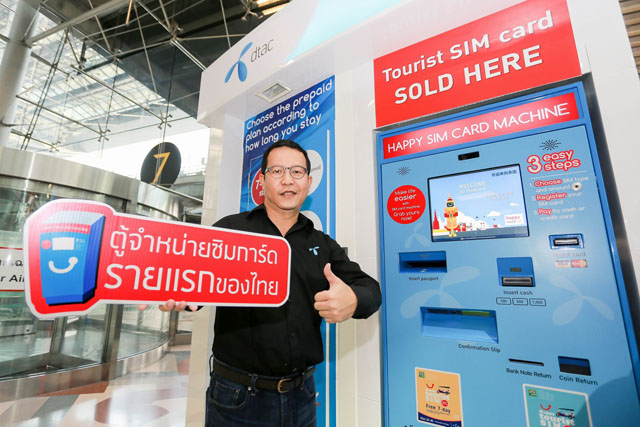 โดยตู้จำหน่ายซิมนี้นับเป็นตู้แรกในไทยที่มีฟังก์ชันการใช้งานอัจฉริยะ สามารถจำหน่ายซิมการ์ดที่ได้รับการลงทะเบียนภายในเครื่องด้วยพาสปอร์ต เพื่อให้ซิมการ์ดสามารถใช้ได้ถูกต้องตามกฎ กสทช. ซิมการ์ดที่ได้รับสามารถเปิดใช้งานได้ทันที นับเป็นนวัตกรรมล่าสุดของวงการโอเปอเรเตอร์ไทยที่มุ่งให้บริการและอำนวยความสะดวกกับนักท่องเที่ยว ด้วยซิมการ์ด 2 แบบ คือ ซิม "แฮปปี้ทัวริสต์ 299 บาท" ที่สามารถใช้งานอินเทอร์เน็ต 4G ด้วยความเร็วอินเทอร์เน็ตสูงสุด 1.5 GB ใช้ได้ต่อเนื่องนาน 7 วัน พร้อมฟรีค่าโทร 100 บาท และซิม "แฮปปี้ทัวริสต์ 599 บาท" ที่สามารถใช้งานอินเทอร์เน็ต 4G ด้วยความเร็วอินเทอร์เน็ตสูงสุด 4GB ใช้ได้ต่อเนื่องนาน 15 วัน พร้อมฟรีค่าโทร 100 บาท ทั้งนี้ ตู้จำหน่ายซิมจะเปิดให้บริการตลอด 24 ชั่วโมงตั้งแต่วันนี้เป็นต้นไป ที่ ศูนย์บริการดีแทค ท่าอากาศยานสุวรรณภูมิ บริเวณอาคารผู้โดยสารขาเข้า ประตู 7