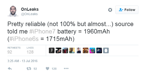 ยิ่งใกล้วันเปิดตัวมากเท่าไหร่ก็ยิ่งมีข่าวออกมาเรื่อยๆ สำหรับ iPhone 7 ล่าสุด OnLeaks เจ้าพ่อจอมปล่อยข่าวลือเจ้าเดิม ได้ออกมาให้ข่าวผ่านทวิตเตอร์ว่า แบตเตอรี่ของ iPhone 7 นั้นอาจจะมีความจุอยู่ที่ 1,960 mAh หากเทียบกับ iPhone 6s ที่มีแบตเตอรี่ขนาด 1,715 mAh แล้ว จะมีความจุเพิ่มขึ้นมากกว่าเดิมถึง 14%