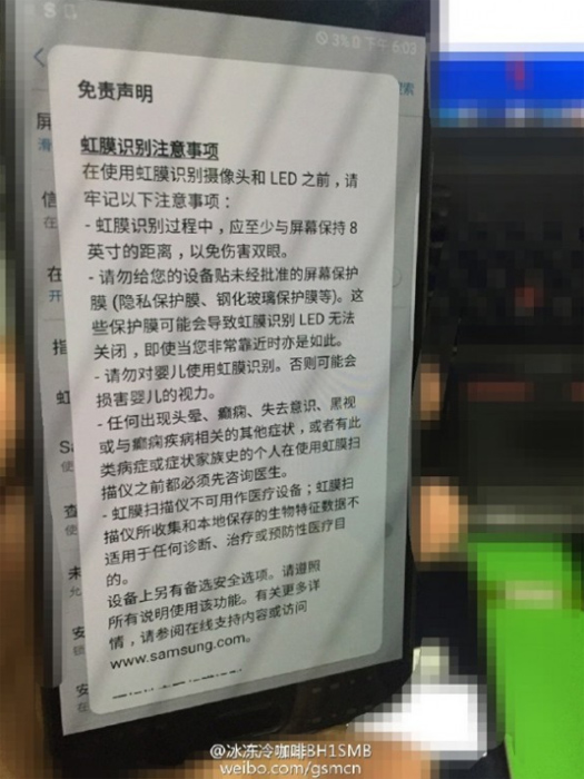 โดยคลิปวิดีโอสั้นๆ ได้เผยให้เห็นการใช้ฟังก์ชั่น Iris Scanner สแกนม่านตาเพือเปิดปลดล๊อกหน้าจอเครื่อง Samsung Galaxy Note 7 ซึ่งแม้จะไม่ชัดเจนมากนัก แต่ก็ทำให้รู้ว่าเครื่องใช้เวลาสแกนม่านตาและเปิดเครื่องได้อย่างรวดเร็วจริงๆ นอกจากนั้นยังมีภาพรายละเอียดหลุดออกมาอีกว่าระบบนี้ใช้งานได้ดีกับเด็กเล็ก รวมถึงคนใส่แว่น หรือคอนแทคเลนส์อีกด้วย ซึ่งระยะห่างที่เหมาะสมที่สุดสำหรับการใช้งานจะอยู่ที่ 25 - 35 ซม.