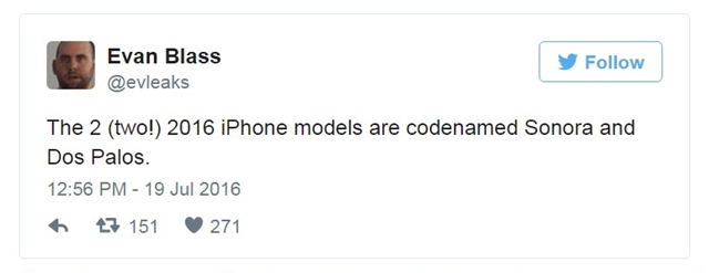 นอกจากนี้ Evan Blass ยังทวิตข้อความอีกว่า ในปี 2016 จะมีการเปิดตัวทั้งหมด 2 รุ่นด้วยกัน ภายใต้โค้ดเนม Sonora และ Dos Palos ไม่ได้ใช้คำว่า iPhone 7 แต่ใช้คำว่า iPhone 2016 แทน และอาจจะมีความเป็นไปได้ที่ในปีนี้ทาง Apple จะยกเลิกการใช้ตัวเลขต่อท้ายคำว่า iPhone
