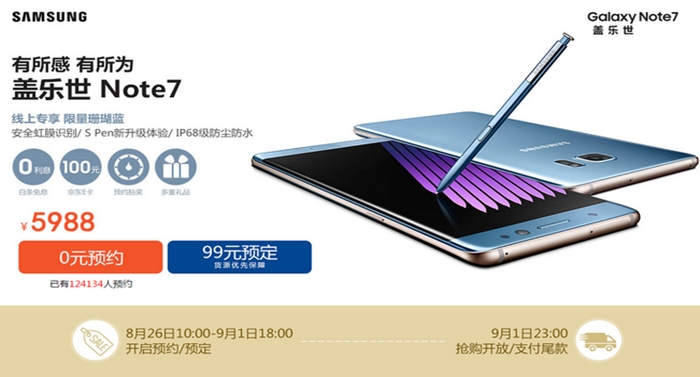 ล่าสุด Samsung ในประเทศจีน ได้มีการเปิดรับจอง Samsung Galaxy Note 7 ล็อตแรกแล้วเป็นที่เรียบร้อย โดยประเดิมด้วยรุ่น RAM 4GB / ROM 64GB ก่อน และจะมีการจัดส่งสินค้าในช่วงต้นเดือนกันยายนนี้ ซึ่งตัวเครื่องของจีนจะแตกต่างจากเกาหลีตรงชิปเซ็ตที่เปลี่ยนจาก Exynos 8890 มาเป็น Snapdragon 820 แทน ส่วนราคาที่เปิดตัวในประเทศจีนนั้นอยู่ที่ 5988 หยวน หรือคิดเป็นเงินไทยประมาณ 31,102 บาท