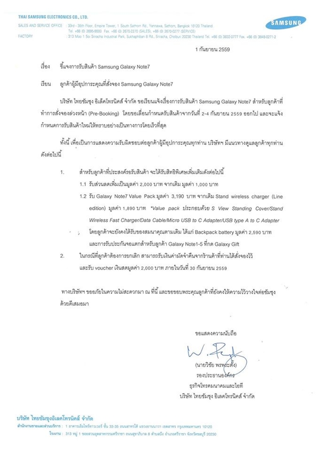 Samsung ประเทศไทย ประกาศเลื่อนการจัดส่ง Galaxy Note 7 อย่างไม่มีกำหนด