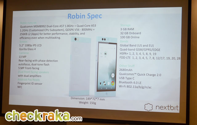ยิ่งไปกว่านั้น สมาร์ทโฟน Nextbit Robin ยังโดดเด่นด้วยดีไซน์ทรงสี่เหลี่ยมและสีสันสุดล้ำไม่เหมือนใคร โดยใช้งานบนระบบปฏิบัติการ Android พร้อมกับจอแสดงผลแบบ Full HD 1080p ขนาด 5.2 นิ้ว IPS LCD ครอบกระจกกันรอย Gorilla Glass 4 และใช้ชิปประมวลผล Qualcomm กับแรม 3GB และมาพร้อมหน่วยความจำภายในตัวเครื่อง 32GB พร้อมพื้นที่บนคลาวด์ฟรีอีก 100GB แถมยังมีกล้องถ่ายรูปด้านหลังความละเอียด 13 ล้านพิกเซล และกล้องด้านหน้าความละเอียด 5 ล้านพิกเซล รองรับการเชื่อมต่อ NFC , USB Type-C พร้อมกับเทคโนโลยีสแกนลายนิ้วมือ และแบตเตอรี่ความจุ 2,680 mAh แถมยังรองรับระบบชาร์จเร็ว Qualcomm Quick Charge 2.0 โดยตัวเครื่องมีให้เลือก 2 สี คือ สีมินต์ และสีดำน้ำเงิน ราคา 12,900 บาท