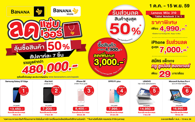 - ซื้อสินค้าใดก็ได้ในร้าน บานาน่า สโตร์ ทุกในเสร็จสามารถนำมาลุ้นซื้อสินค้า 50 % ได้ที่ www.bananastore.com/zapsale