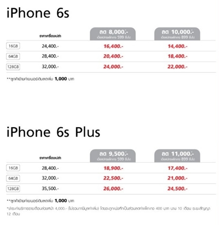 โดยเจ้าตัว iPhone 6s ให้ส่วนลดสูงสุดถึง 11,000 บาท หรือเริ่มต้นเพียง 14,400 บาท เท่านั้น และสำหรับลูกค้าย้ายค่ายเบอร์เดิมจะได้ส่วนลดเพิ่มอีก 1,000 บาท ซึ่ง iPhone 6s ส่วนลด 8,000 บาท เมื่อสมัครแพ็คเกจ 599 ขึ้นไป ส่วนลด 10,000 บาท เมื่อสมัครแพ็คเกจ 899 ขึ้นไป และสำหรับหรับรุ่น iPhone 6s Plus ลด 9,500 บาท เมื่อสมัครแพ็คเกจ 599 ขึ้นไป ส่วนลด 11,000 บาท เมื่อสมัครแพ็คเกจ 899 ขึ้นไป