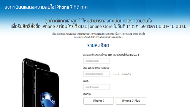 ลูกค้าดีแทคและลูกค้าใหม่สามารถลงทะเบียนแสดงความสนใจ เพื่อรับสิทธิ์สั่งซื้อ iPhone 7 ก่อนใคร ที่ dtac online store ในวันที่ 14 ต.ค. 59 เวลา 00.01 - 10.00 น. เมื่อลงทะเบียนเรียบร้อยแล้วกรุณารอรับข่าวสารและรหัสผ่านในการสั่งซื้อทาง SMS และ email อีกครั้ง (การลงทะเบียนนี้ยังมิใช่การสั่งซื้อสินค้าแต่อย่างใด)
