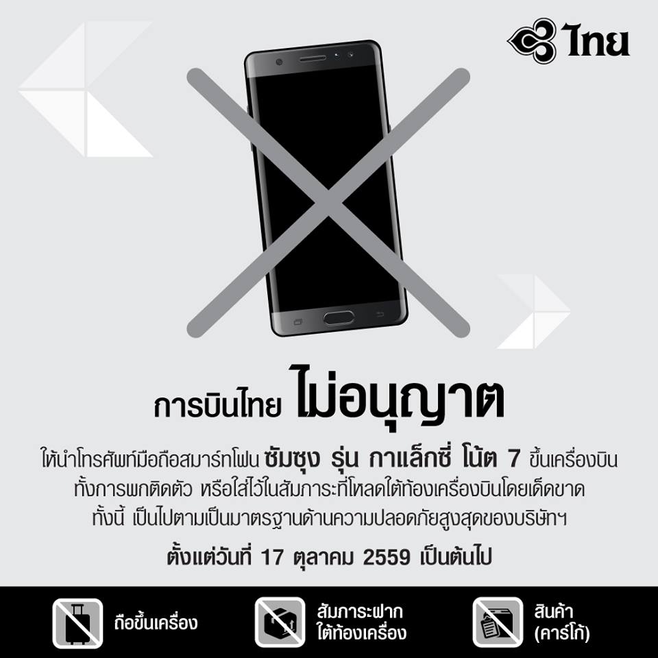 การบินไทยห้ามนำ Samsung Galaxy Note 7 ขึ้นเครื่องบินทุกกรณี