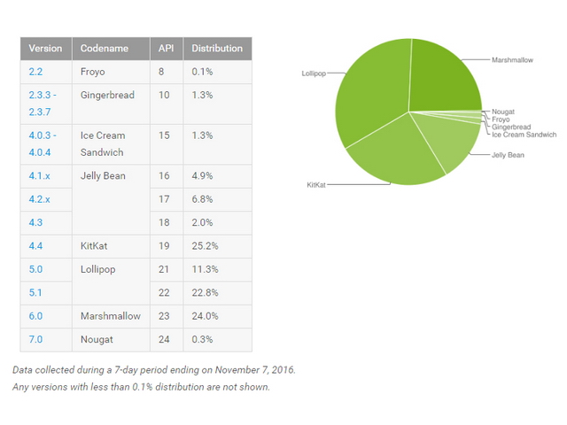 Android Nougat ซึ่งเป็น Android เวอร์ชั่นที่เปิดตัวมาตั้งแต่วันที่ 22 สิงหาคมที่ผ่านมา จากข้อมูลล่าสุดเผยให้เห็นว่ามีการติดตั้งเพียงแค่ 0.3% เท่านั้น จากอุปกรณ์ของระบบ Android ทั้งหมด ซึ่งมันก็จริงตามนั้นครับ เพราะอุปกรณ์ที่สามารถรัน Android Nougat ในปัจจุบันนี้นับหัวได้เลย มีเพียงแค่ LG V20, Nexus devices และ Pixel C เท่านั้นที่รัน Android 7.0 Nougat (ไม่นับ Google Pixel และ Pixel XL เพราะรัน Android 7.1 Nougat)