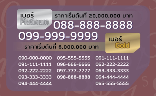 - กลุ่มเลขหมาย Platinum โดยมีเบอร์ 9 ตัวเหมือน จำนวน 2 เบอร์ ได้แก่ 088-888-8888 และ 099-999-9999 ได้กำหนดราคาเริ่มต้นการประมูลไว้ที่ 20 ล้านบาท