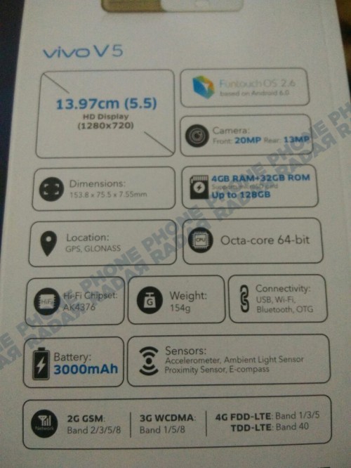 โดยจากข้อมูลที่หลุดออกมานั้น คาดว่า vivo V5 จะมาพร้อมหน้าจอขนาด 5.5 นิ้ว ความละเอียด HD 720P, รองรับการใช้งาน 2 ซิม, 4G FDD-LTE Band 1/3/5 และ TDD-LTE Band 40, ตัวเครื่องมีขนาด 153.8 x 75.5 x 7.55 มม. น้ำหนัก 154 กรัม มาพร้อม Android 6.0 Marshmallow ครอบทับด้วย Funtouch OS 2.6, RAM 4GB, หน่วยความจำภายใน 32GB สามารถเพิ่ม Micro SD Card ได้สูงสุด 128GB CPU Octa Core 64 bit, ชิปเสียง HiFi AK4376, แบตเตอรี่ความจุ 3,000 mAh, เชื่อมต่อ Wi-Fi, GPS, GLONASS, เซ็นเซอร์ Acelerometer, Light, Proximity, E-compass แม้จะมีจุดเด่นคือกล้องหน้าความละเอียดสูง 20MP แต่กล้องหลังกับให้ความละเอียดมาเพียงแค่ 13MP เท่านั้น