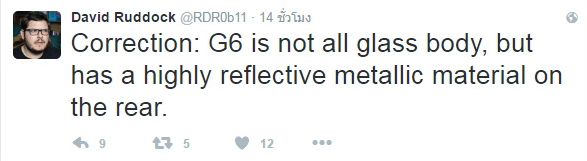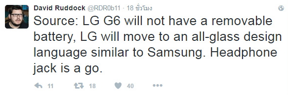David Ruddock บรรณาธิการ Androidpoice ได้ทวีตข้อความเกี่ยวกับสมาร์ทโฟนระดับเรือธงของแบรนด์ยักษ์ใหญ่จากเกาหลีใต้ อย่าง LG G6 ว่าสมาร์ทโฟนรุ่นนี้จะไม่สามารถถอดเปลี่ยนแบตเตอรี่ได้ และวัสดุจะเป็นกระจกเช่นเดียวกับแบรนด์ Samsung แต่จะมีวัสดุโลหะแวววาวที่ด้านหลังด้วย? (ชักอยากจะเห็น เพราะจินตนาการไม่ออกจริงๆ ว่าหน้าตาจะเป็นอย่างไร) และยังคงมีพอร์ตหูฟัง 3.5 มม. (เดี๋ยวนี้กลายเป็นว่าต้องระบุให้ชัดๆ กันไปแล้ว เพราะแฟชั่นการเอาพอร์ตหูฟังออก มันแพร่หลายเหลือเกิน)