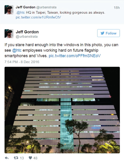 เป็นข่าวที่น่ายินดีสำหรับแฟนๆ HTC ครับ หลังจากที่ก่อนหน้านี้มีข่าวไม่สู้ดีที่ว่าอาจจะตัดสินใจขายกิจการในส่วนของสมาร์ทโฟน แต่ล่าสุดคุณ Jeff Gordon ผู้จัดการฝ่ายประชาสัมพันธ์ของ HTC ได้ทวีตภาพอาคารสำนักงานของ HTC ในประเทศใต้หวัน ผ่านทาง Twitter พร้อมด้วยข้อความว่า "ทุกคนยังทำงานอย่างหนักเพื่อสมาร์ทโฟนระดับเรือธงรุ่นใหม่ รวมทั้ง HTC Vives (แว่น VR) รุ่นใหม่" ซึ่งเป็นการแสดงถึงจุดยืนว่า HTC ยังไม่ยอมแพ้ และในปีหน้าเราจะได้ตื่นเต้นกับสมาร์ทโฟนเรือธงจาก HTC แถมยังไม่ใช่แค่รุ่นเดียวซะด้วย