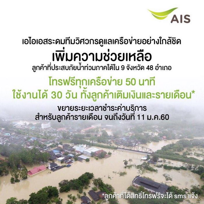 นางวิไล เคียงประดู่ ผู้ช่วยกรรมการผู้อำนวยการอาวุโส ส่วนงานประชาสัมพันธ์ บริษัท แอดวานซ์ อินโฟร์ เซอร์วิส จำกัด (มหาชน) หรือ เอไอเอส กล่าวว่า "นอกจากการขยายระยะเวลาการชำระค่าบริการสำหรับลูกค้ารายเดือนที่เอไอเอสได้ดำเนินการช่วยเหลือลูกค้าไปแล้วตั้งแต่วันที่ 4 ม.ค.60 ที่ผ่านมา แต่เนื่องจากเหตุการณ์น้ำท่วมภาคใต้ในครั้งนี้ยังมีผลกระทบกับลูกค้าอย่างต่อเนื่อง ดังนั้นเอไอเอสจึงเพิ่มความช่วยเหลือให้แก่ลูกค้าที่ได้รับความเดือดร้อนใน 48 อำเภอ 9 จังหวัด ได้แก่ นครศรีธรรมราช, สุราษฎร์ธานี, ชุมพร, ตรัง, นราธิวาส, ปัตตานี, พัทลุง, ยะลา และสงขลา โดยให้ลูกค้าทั้งระบบเติมเงินและรายเดือนโทรฟรีทุกเครือข่าย 50 นาที ใช้งานได้ 30 วัน เริ่มตั้งแต่วันนี้เป็นต้นไป โดยลูกค้าที่ได้รับสิทธิ์โทรฟรีจะได้รับ SMS แจ้ง