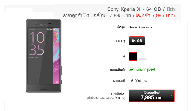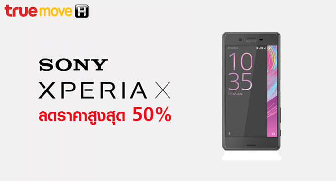 TrueMove H จัดโปรโมชั่นพิเศษ Sony Xperia X ลดราคาสูงสุด 50% เมื่อเปิดเบอร์ใหม่ เหลือเพียง 7,995 บาท (จากราคาเต็ม 15,990 บาท) พร้อมสมัครแพ็กเกจ TrueMove H 4G+ Super Smart 699 บาทต่อเดือนขึ้นไป โดยจะต้องชำระค่าบริการล่วงหน้า 1,500 บาท (ติดสัญญา 12 เดือน)