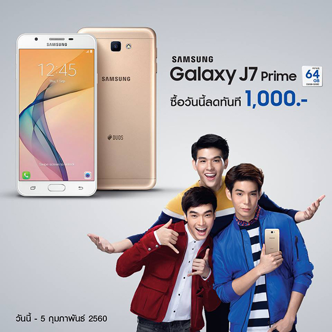 Samsung ได้มอบโปรโมชั่นสุดคุ้มสำหรับลูกค้าที่ซื้อ Samsung Galaxy J7 Prime วันนี้ ลดทันที 1,000 บาท จากราคาปกติ 9,900 บาท เหลือเพียง 8,900 บาท วันนี้ - 5 กุมภาพันธ์ 2560