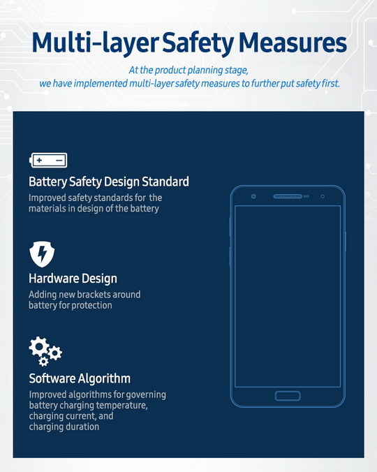 2. ใช้ "มาตรการตรวจสอบความปลอดภัยหลายชั้น (Multi-layer Safety Measures Protocol)" สำหรับเป็นขั้นตอนในการวางแผนการผลิตของซัมซุงให้มีกระบวนการหลากหลายพื่อความปลอดภัยของสมาร์ทดีไวซ์เพื่อเน้นย้ำความปลอดภัยในผลิตภัณฑ์ เริ่มตั้งแต่