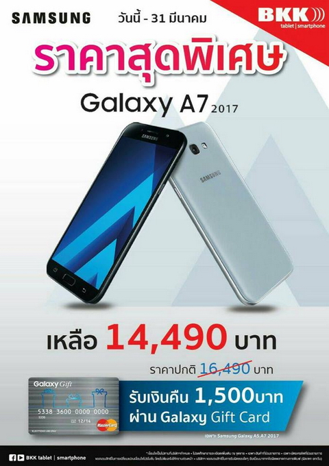 Samsung Galaxy A7 (2017) สมาร์ทโฟนที่ครบเครื่องมากๆ อีกรุ่นหนึ่งของ Samsung ซึ่งเปิดตัวและวางจำหน่ายไปไม่นาน ล่าสุดปรับลดราคาเหลือเพียง 14,490 บาท (จากราคาเปิดตัว 16,490 บาท) พร้อม Voucher มูลค่า 1,500 บาท (หรือรับเป็นส่วนลดไปเลยก็ได้) นั้นเท่ากับว่า Samsung Galaxy A7 2017 จะเหลือเพียงแค่ 12,990 บาทเท่านั้นครับ ถือว่าลดราคาลงเยอะมากๆ