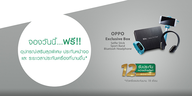 OPPO R9s สามารถจองได้แล้ววันนี้ พร้อมรับ OPPO Exclusive Box ฟรี! ประกอบไปด้วย Selfie Stick + Sport Band + Bluetooh Headphone นอกจากนี้ยังจะได้รับ อุปกรณ์เสริมสุดพิเศษ พร้อมประกันหน้าจอ 12 เดือน และระยะเวลารับประกันเครื่องยาวนานถึง 18 เดือน (เริ่มส่งสินค้าตั้งแต่วันที่ 11 มี.ค. 60 เป็นต้นไป)