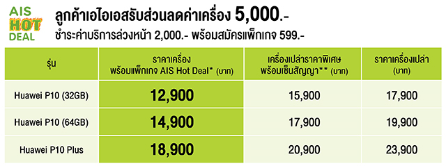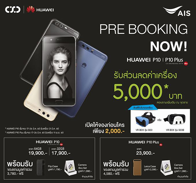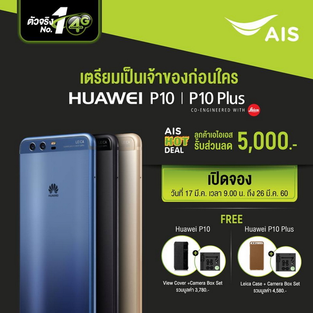 ทางด้าน AIS ยังให้ผู้ที่สนใจสามารถเป็นเจ้าของ Huawei P10 และ P10 Plus ก่อนใคร พร้อมส่วนลด 5,000 บาท เปิดจอง วันนี้ - 26 มี.ค. 60