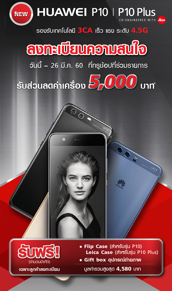 www.ais.co.th/huawei ด้าน TrueMove H เปิดให้ลงทะเบียนความสนใจ Huawei P10 และ P10 Plus ได้ตั้งแต่วันนี้ - 26 มีนาคม 2560 ที่ทรูช้อปที่ร่วมรายการ พร้อมรับส่วนลด 5,000 บาท และของแถมสุดพิเศษ