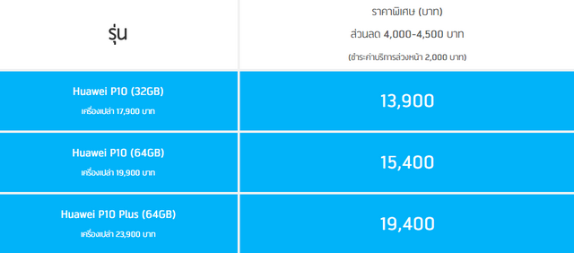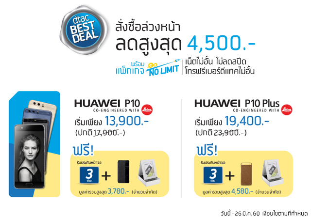 truemoveh.truecorp.co.th ส่วนทางด้าน dtac ให้คุณสั่งซื้อ Huawei P10 และ P10 Plus พร้อมข้อเสนอสุดคุ้ม ลดสูงสุด 4,500 บาท รับฟรีของแถมมูลค่ารวมสูงสุด 4,580 บาท พร้อมเล่นเน็ต4G ได้สูงถึง 16GB ตั้งแต่วันนี้ - 26 มี.ค. 2560