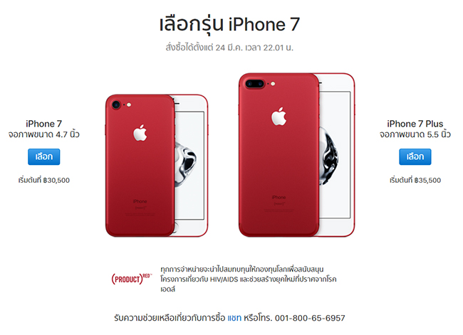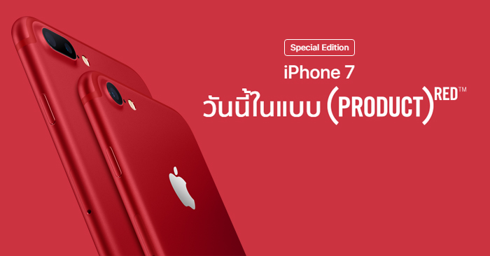 สำหรับ iPhone 7 และ iPhone 7 Plus สีแดง (PRODUCT)RED Special Edition มีวางจำหน่ายพร้อมกันทั่วโลกผ่านทาง Apple Store วันที่ 24 มีนาคมนี้ เป็นต้นไป ในราคาเท่าเครื่องสีอื่นๆ (แนะนำว่าควรซื้อเคสหนัง หรือซิลิโคนสีแดงของ Apple มาใช้ร่วมกันด้วยนะครับ จะเข้ากันสุดๆ งานนี้ได้ทั้งเครื่องสีสวย และได้ทำบุญไปในตัวด้วยนะครับ) โดยทุกการจำหน่ายผลิตภัณฑ์ (RED) จะนำไปสบทบทุนให้กองทุนโลก เพื่อต่อต้านโรคเอดส์โดยตรง หรือถ้าสนใจสามารถสบทบทุนให้กองทุนโลกโดยตรงผ่านทาง Apple Store ได้เลย