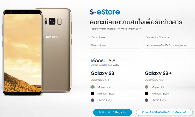 สำหรับ Samsung Galaxy S8 และ Samsung Galaxy S8+ จะมีการนำเข้ามาวางจำหน่ายในประเทศไทย 3 สี ได้แก่ Maple Gold (สีทอง), Midnight Black (สีดำ) และ Orchid Grey (ม่วงเทา) สามารถอ่านเพิ่มเติมจุดเด่นและฟังก์ชั่นที่สำคัญได้ตามลิ้งค์ด้านล่างลิงค์นี้เช่นกันครับ