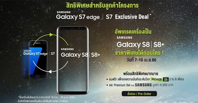 S7 ในแคมเปญ Exclusive Deal ระหว่างวันที่ 18 มี.ค. - 30 เม.ย. 2559 ให้นำเครื่องโทรศัพท์ Samsung Galaxy S7 edge หรือ S7 เครื่องเดิมมาแลกซื้อ