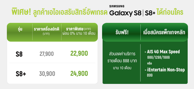 จัดเต็ม! สมการรอคอย เอไอเอส จับมือ ซัมซุง เปิดให้ลูกค้าที่เป็นเจ้าของ Samsung Galaxy S7 และ Samsung Galaxy S7 edge ในโครงการเอ็กซ์คลูซีฟดีล (ระหว่างวันที่ 18 มี.ค. - 30 เม.ย. 59) มาอัพเกรดเป็น Samsung Galaxy S8 และ Samsung Galaxy S8+ ได้ในราคาพิเศษ