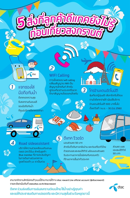 www.dtac.co.th/postpaid/services/roaming/ สำหรับลูกค้า BLUE MEMBER ที่อาจประสบปัญหาในการเดินทางช่วงเทศกาล อย่าลืมใช้บริการ Roadside assistant บริการให้ความช่วยเหลือฉุกเฉินบนท้องถนนทั่วประเทศตลอด 24 ชม. โดยช่างผู้เชียวชาญ ให้คุณอุ่นใจทุกการเดินทาง
