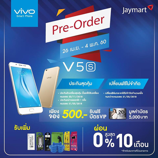 เพื่อนๆ คนไหนที่สนใจ Vivo V5s หากสะดวกที่ไหนก็รีบจองกันได้เลยนะครับ ต้องบอกเลยว่าแต่ละเจ้าจัดโปรโมชั่น พร้อมด้วยของแถมจัดเต็มทั้งนั้น