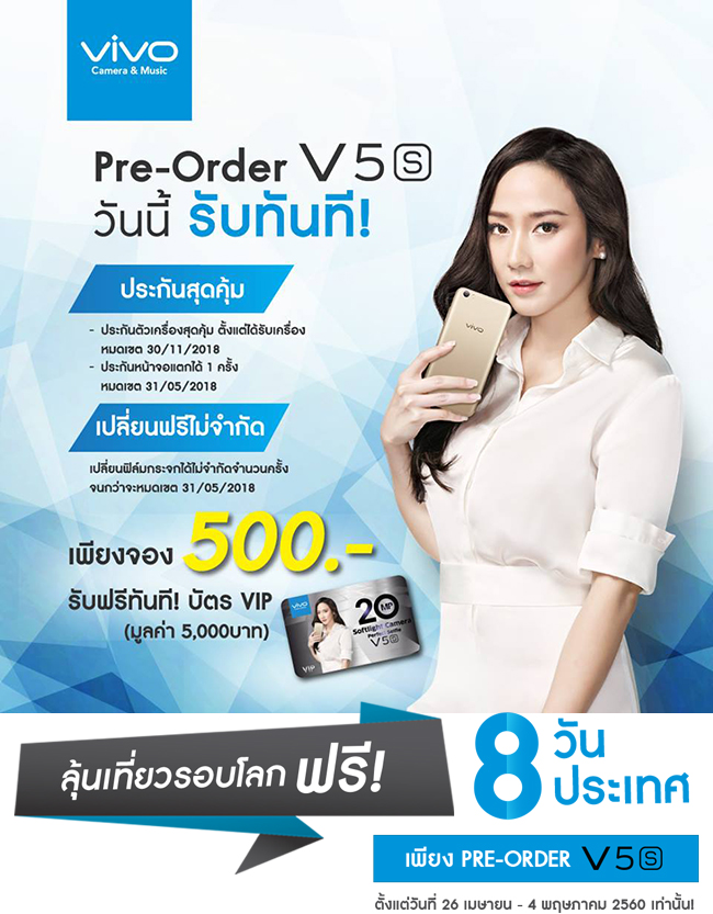 Pre-Order สมาร์ทโฟน Vivo V5s วันนี้! รับทันที ประกันสุดคุ้ม / VIP CARD และเปลี่ยนฟิล์มกระจกฟรีไม่จำกัด พร้อมลุ้นเที่ยวรอบโลกฟรี 8 วัน 8 ประเทศ ในกิจกรรม Around the world ตั้งแต่วันที่ 26 เมษายน - 4 พฤษภาคม 2560