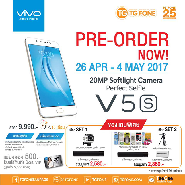 โปรโมชั่นมาแรงสำหรับลูกค้าจอง V5s ที่ TG FONE ทุกสาขา รับฟรีทันที บัตรVIP มูลค่า 5,000บาท พร้อมของพรีเมี่ยมเซท เลือกได้