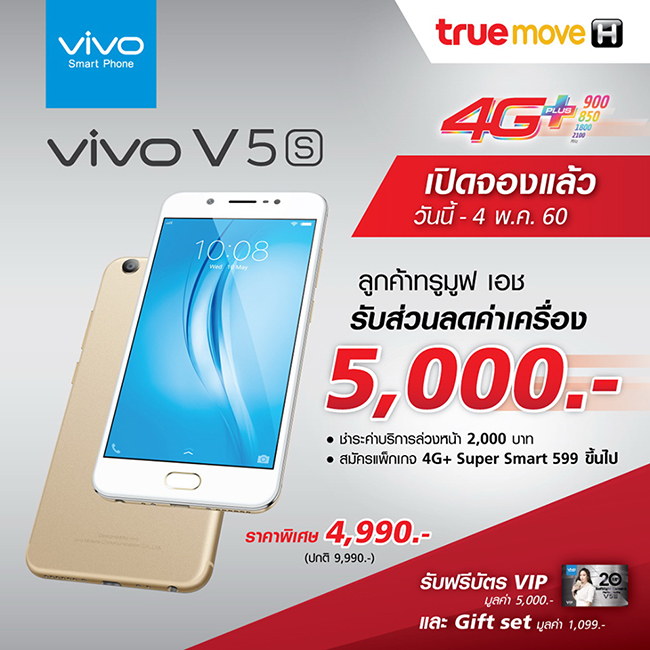 ทรูมูฟ เอช เปิดให้จองเป็นเจ้าของ Vivo V5s ได้แล้ววันนี้ รับฟรี บัตร VIP CARD มูลค่า 5,000 บาท และ Gift set มูลค่า 1,099 บาท กับโปรโมชั่นสุดพิเศษส่วนลดค่าเครื่องสูงสุดถึง 5,000 บาท เพียงเปิดเบอร์และสมัครแพ็คเก็ต 4G+ Super Smart 599 ขึ้นไป พร้อมชำระค่าบริการล่วงหน้า 2,000 บาท แล้วอย่าลืมมาเป็นเจ้าของกันนะคะ (สอบถามรายละเอียดเพิ่มเติมได้ที่ทรูช้อปที่ร่วมรายการ)