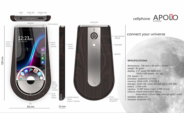 ปกติเรามักจะเคยชินกับสมาร์ทโฟนที่มีดีไซน์เป็นแบบทรงเหลี่ยมๆ แท่งๆ แต่ล่าสุดมีการเปิดเผยภาพดีไซน์ของสมาร์ทโฟนรุ่นใหม่อย่าง APOLLO 1 ซึ่งคอนเซ็ปต์ของเจ้าสมาร์ทโฟนรุ่นนี้คือมีดีไซน์ล้ำ ดูหรูหรา จะเห็นได้ว่า ตัวเครื่องนั้นมีรูปทรงเหลี่ยมและผสมกับแบบโค้งมน วัสดุของเจ้ารุ่นนี้นั้นทำจากไม้ และมีบางส่วนเป็นอะลูมิเนียม