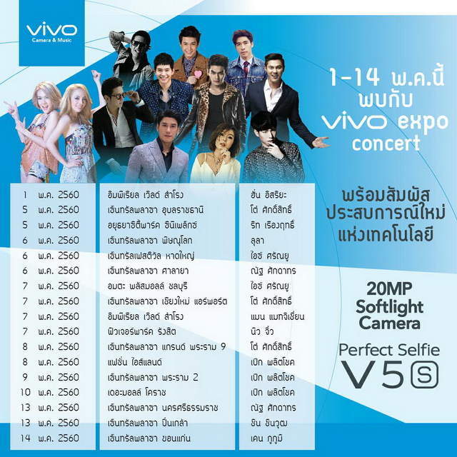 ภายในกิจกรรม คุณจะพบกับโปรโมชั่นสุดพิเศษที่ Vivo จัดให้เป็นพิเศษเฉพาะในงาน และเตรียมพบกับกองทัพศิลปินที่ตบเท้ากันมาอย่างเนืองแน่น อาทิ เป๊ก ผลิตโชค, โต๋ ศักดิ์สิทธิ์, ฮั่น The Star, ริท The Star, เบล สุพล, ชิน ชินวุฒ, ไอซ์ ศรัญยู, ลุลา, เคน ภูภูมิ, นัท ศักดาทร ที่จะมาร่วมมอบความสุขตลอดช่วงกิจกรรม