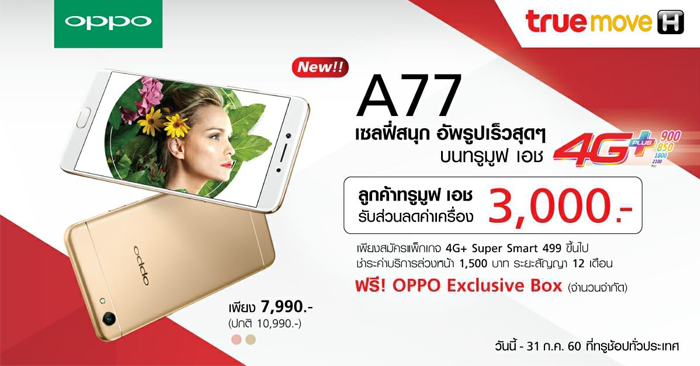 ทรูมูฟ เอช จัดโปรโมชั่นเอาใจคนรักการถ่ายเซลฟี่ กับสมาร์ทโฟน OPPO A77 ซื้อวันนี้รับส่วนลดค่าเครื่องทันที 3,000 บาท เหลือเพียง 7,990 บาท (จากปกติ 10,990 บาท) เมื่อสมัครแพ็กเกจ 4G+ Super Smart 499 ขึ้นไป พร้อมชำระค่าบริการล่วงหน้า 1,500 บาท ระยะสัญญา 12 เดือน พร้อมรับฟรี! OPPO Exclusive Box (จำนวนจำกัด)