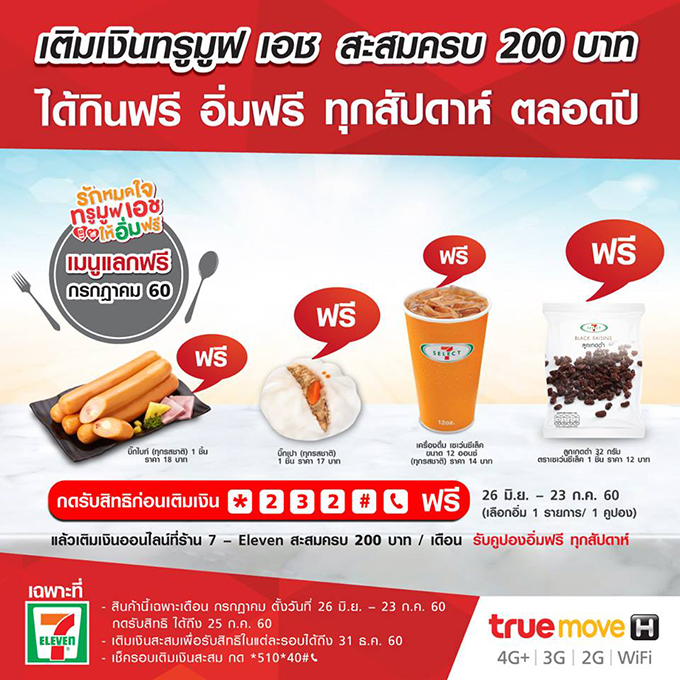 ทรูมูฟ เอช ผู้ให้บริการเครือข่าย 4G+ อันดับ 1 ครอบคลุมทั่วไทย ยกระดับความร่วมมือกับ 7-Eleven จัดแคมเปญ "รักหมดใจ ทรูมูฟ เอช ให้อิ่มฟรี" มอบสิทธิพิเศษสำหรับลูกค้าเติมเงินทั้งประเทศ ได้อิ่มฟรีทุกสัปดาห์ตลอดทั้งปี 2560 ที่ร้าน 7-Eleven ทุกสาขา ง่ายๆ เพียงเติมเงินออนไลน์ที่ 7- Eleven สะสมจนครบ 200 บาทต่อเดือน แล้วรอรับคูปองทาง SMS สำหรับแลกอาหารหรือเครื่องดื่มฟรีสัปดาห์ละ 1 ครั้ง