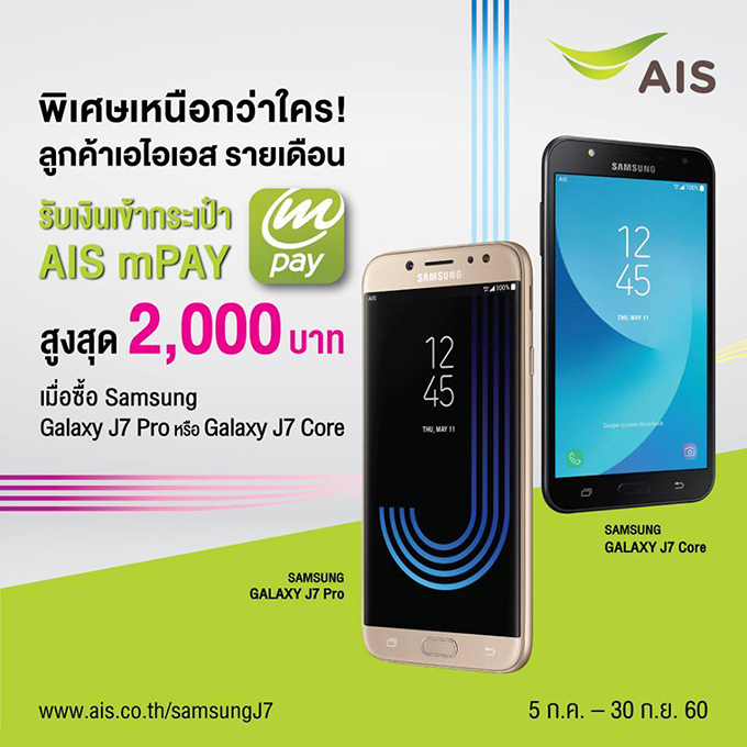 ซื้อ Samsung Galaxy J7 Pro หรือ J7 Core รับเงินเข้ากระเป๋า AIS mPAY สูงสุด 2,000 บาท