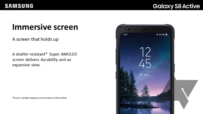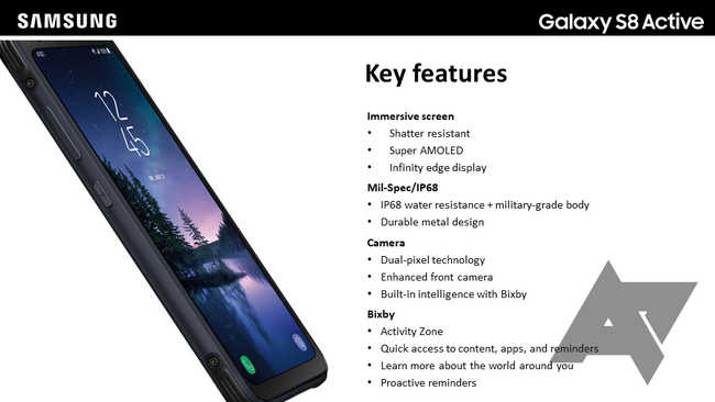 Samsung Galaxy S8 Active จะมาพร้อมมาตรฐานกันน้ำ และฝุ่นระดับ IP68 และรองรับมาตรฐานทางการทหาร MIL-STD-810G หน้าจอ Super AMOLED ไร้ขอบ อัตราส่วน 18.5:9 ขนาด 5.8 นิ้ว ความละเอียด QHD+ กระจก Gorilla Glass 5, ชิปเซ็ต Snapdragon 835, RAM 4GB, หน่วยความจำภายใน 64GB (รองรับ MicroSD), กล้องความละเอียด 12MP ค่ารูรับแสง F1.7 มาพร้อมเทคโนโลยี Dual-Pixel ส่วนกล้องหน้าความละเอียด 8MP ค่ารูรับแสง F1.7 บันทึกวีดีโอความละเอียด 4K 30fps และมาพร้อมผู้ช่วยอัจฉริยะ Bixby, Bluetooth 5.1, Wi-Fi, NFC, MST, A-GPS + Glonass