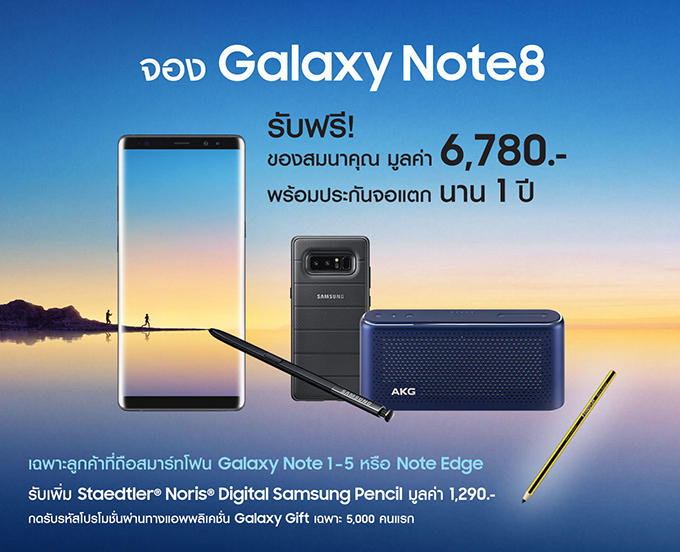 ซัมซุง ประเทศไทย เปิดให้จองสมาร์ทโฟน Samsung Galaxy Note 8 ในวันที่ 1 - 17 กันยายน 2560 และเริ่มรับเครื่องวันที่ 22 กันยายน งานนี้ของแถมมาเพียบ รวมมูลค่า 8,370 บาท ประกอบด้วย