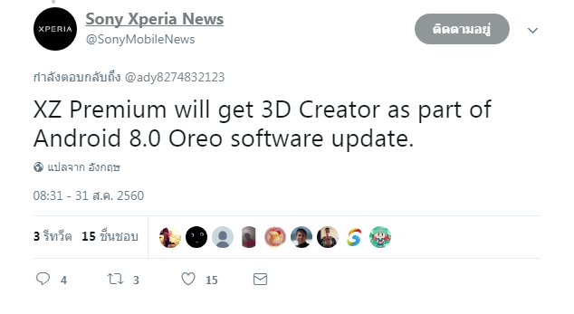 ล่าสุด มีการประกาศออกมาแล้วว่าสมาร์ทโฟนระดับเรือธงประจำปีนี้อย่าง Sony Xperia XZ Premium ก็จะได้เล่นฟีเจอร์นี้ด้วยเช่นกัน เมื่ออัพเดต Android 8.0 Oreo เรียบร้อยแล้ว นอกจากฟีเจอร์ 3D Creator ทาง Sony ยังจะปรับปรุงเรื่องกล้องให้ด้วยนะครับ โดยจะปรับปรุง Auto Focus ให้ดียิ่งขึ้น รวมไปถึงฟีเจอร์ Predictive Capture (จับภาพวัตถุที่เคลื่อนไหว ก่อนลั่นชัตเตอร์ เพื่อให้สามารถถ่ายภาพเคลื่อนไหวได้แม่นยำยิ่งขึ้น) ก็จะได้รับการปรับปรุงให้สมบูรณ์กว่าเดิมอีกด้วย อดใจรอกันได้เลยครับ