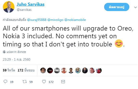 Juho Sarvikas ผู้บริหารระดับสูงของ HMD ยืนยันผ่านทาง Twitter ว่าสมาร์ทโฟนของ Nokia ทุกรุ่น ได้แก่ Nokia 3, Nokia 5, Nokia 6 และ Nokia 8 จะได้รับการอัพเดต Android Oreo ซึ่งจะตรงกับข้อมูลก่อนหน้านี้ ที่มีรายงานว่า Nokia จะอัพเดตให้ลูกค้าภายในสิ้นปีนี้นะครับ ใครที่ชื่อชอบการอัพเดตผมขอแนะนำสมาร์ทโฟนจาก Nokia เลยครับ เพราะเป็น Pure Android แถมยังมีการจับมือกับทาง Google ให้ดูแลเรื่องการอัพเดตให้อีกด้วย งานนี้วางใจได้เลยครับ ว่าจะได้อัพเดตกันยาวๆ ไม่แพ้สมาร์ทโฟนตระกูล Nexus และ Google Pixel เลยทีเดียว