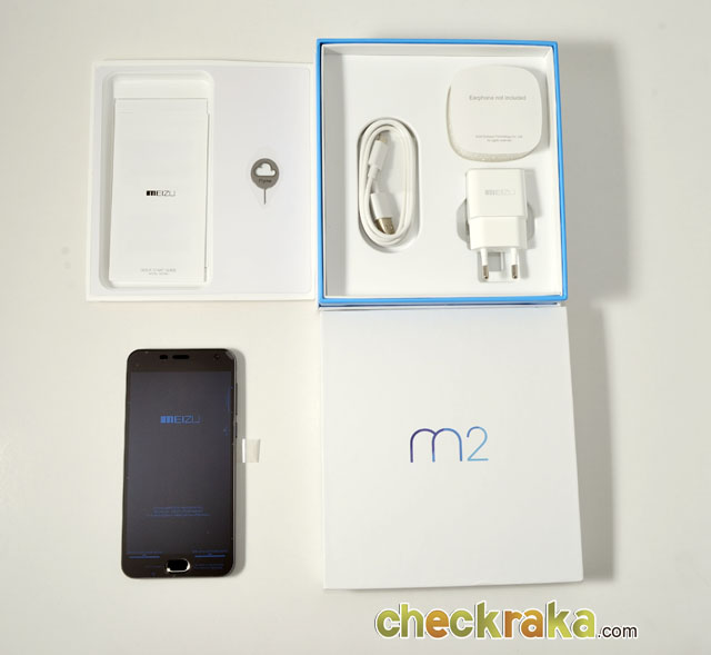 ภายในกล่องมาพร้อมกับตัวเครื่อง, สาย USB สำหรับถ่ายโอนข้อมูล และชาร์จไฟ, อแดปเตอร์สำหรับชาร์จไฟ, ที่จิ้มสำหรับเปลี่ยนซิม และการ์ด MicroSD โดยไม่มีหูฟังมาให้เหมือนกับ Meizu m2 note