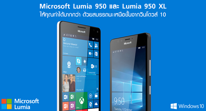 บริษัท ไมโครซอฟท์ (ประเทศไทย) จำกัด ประกาศวางจำหน่ายสมาร์ทโฟน Lumia 950 และ Lumia 950 XL ทั่วประเทศไทย เพื่อเสริมทัพดีไวซ์ตระกูล Lumia พร้อมแนะนำระบบปฏิบัติการวินโดวส์ 10 สู่ตลาดสมาร์ทโฟนเป็นครั้งแรก ทั้งนี้ Lumia 950 และ Lumia 950 XL พร้อมมอบประสบการณ์ที่คุ้นเคยกับการทำงานร่วมกันกับอุปกรณ์วินโดวส์อื่นๆ