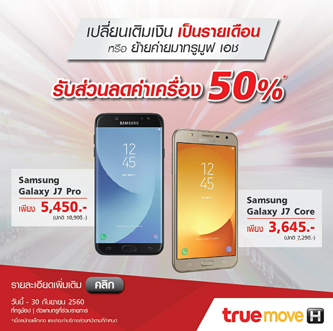 โปรโมชั่นสุดโดนใจ สำหรับใครที่กำลังสนใจสมาร์ทโฟนรุ่นยอดฮิต Samsung Galaxy J7 Pro และ Samsung Galaxy J7 Core เพียงเปลี่ยนจากเติมเงินเป็นรายเดือน หรือย้ายค่ายมา ทรูมูฟ เอช รับส่วนลดค่าเครื่องทันที 50%