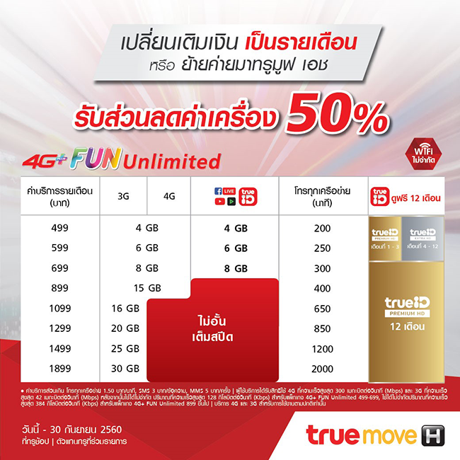 - เมื่อสมัครแพ็กเกจ 4G+ Fun Unlimited 499 บาทขึ้นไป