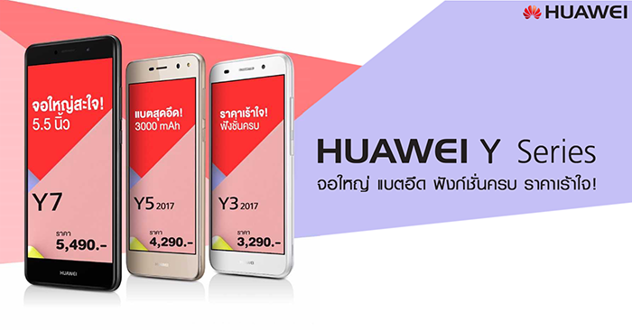 Huawei Y7 และ Huawei Y3 (2017) กำหนดวางจำหน่ายตั้งแต่วันที่ 22 กันยายนเป็นต้นไป ในราคา 5,490 บาท และ 3,290 บาท ส่วน Huawei Y5 (2017) มีกำหนดวางจำหน่ายในเดือนตุลาคมนี้ ในราคา 4,290 บาท ที่ หัวเว่ยแบรนด์ช้อปและตัวแทนจำหน่ายหัวเว่ยทั่วประเทศ