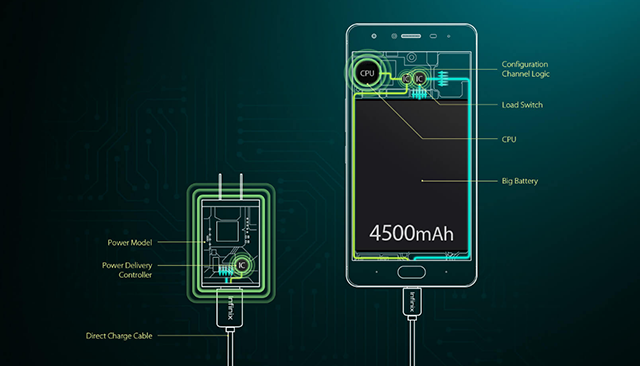 Infinix Note4 Pro มาพร้อมแบตเตอรี่ความจุสูง 4,500 mAh รองรับเทคโนโลยีชาร์จเร็ว Xcharge 4.0 ด้วยระบบการชาร์จแบบ 5V5A ที่จะเพิ่มประสิทธิภาพใน การชาร์จแบตเตอรี่ได้ถึง 96% ด้วยการชาร์จเร็วเพียง 30 นาที ก็เพียงพอที่จะใช้งานได้ตลอดทั้งวัน หรือชาร์จเพียง 5 นาที ก็สามารถสนทนาต่อเนื่องได้ยาวนานถึง 250 นาทีเลยทีเดียว รวมทั้งช่วยลดการสูญเสียพลังงานในระหว่างชาร์จ และลดความร้อนที่เกิดจากการชาร์จเพื่อความปลอดภัยมากยิ่งขึ้น