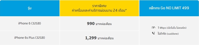 รายละเอียดมีดังนี้ - iPhone 6 32GB ผ่อน 0% ค่าเครื่อง 456 บาท และค่าบริการรายเดือน 534 บาท รวมเป็น 990 บาท นาน 24 เดือน